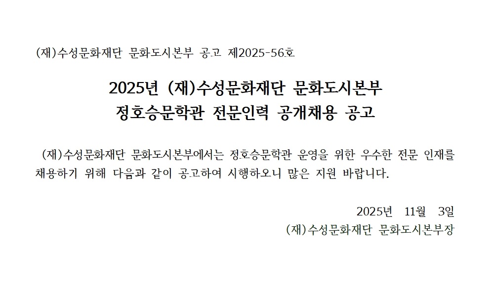 (재)수성문화재단 문화도시본부 정호승문학관 전문인력 공개채용 공고